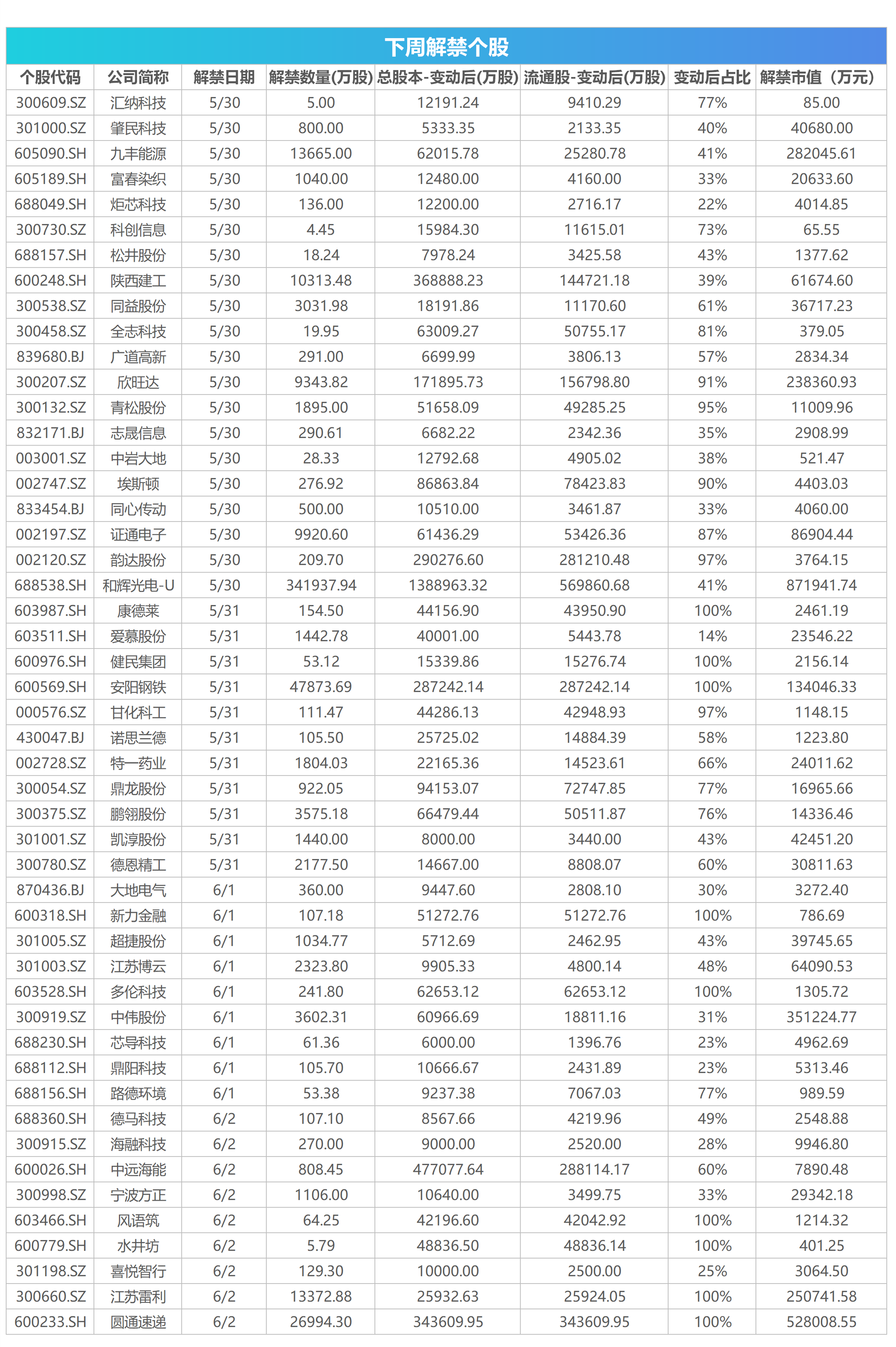 Wind数据统计显示,下周(5月30日-6月2日)共有49家公司限售股陆续解禁,合计解禁量50.41亿股,按5月27日收盘价计算,解禁市值为327.24亿元。