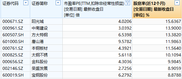 值得一提的是,从业绩角度来看,在前述218家低市盈率公司中,目前已有81家披露了2021年业绩预告,其中预增为主旋律,达到62家,另有2家实现扭亏。从股息率角度看,多达127家低市盈率公司最近12个月的股息率超过3%。在这127家公司中,又有56家公司的股息率超过5%,其中阳光城、中南建设、方大特钢等公司的股息率甚至超过10%。