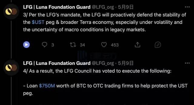 此时LFG想要用比特币来“撑场”了,它发推特宣布将“贷出”自己7亿美元的比特币储蓄,希望通过UST和比特币(而不是UST与暴跌的Luna)之间的相互兑换来维护UST的稳定。