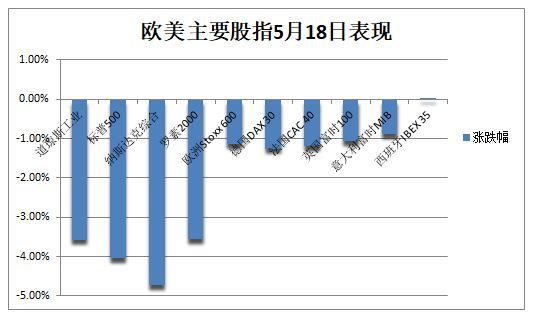 5月18日周三,盘前美股期指便大幅下跌,标普500指数期货和纳指期货均跌1%。美股集体低开,纳指开盘跌1.5%,标普跌1.1%,道指跌0.8%。随后美股便展开了延续全天的“狂泄潮”。