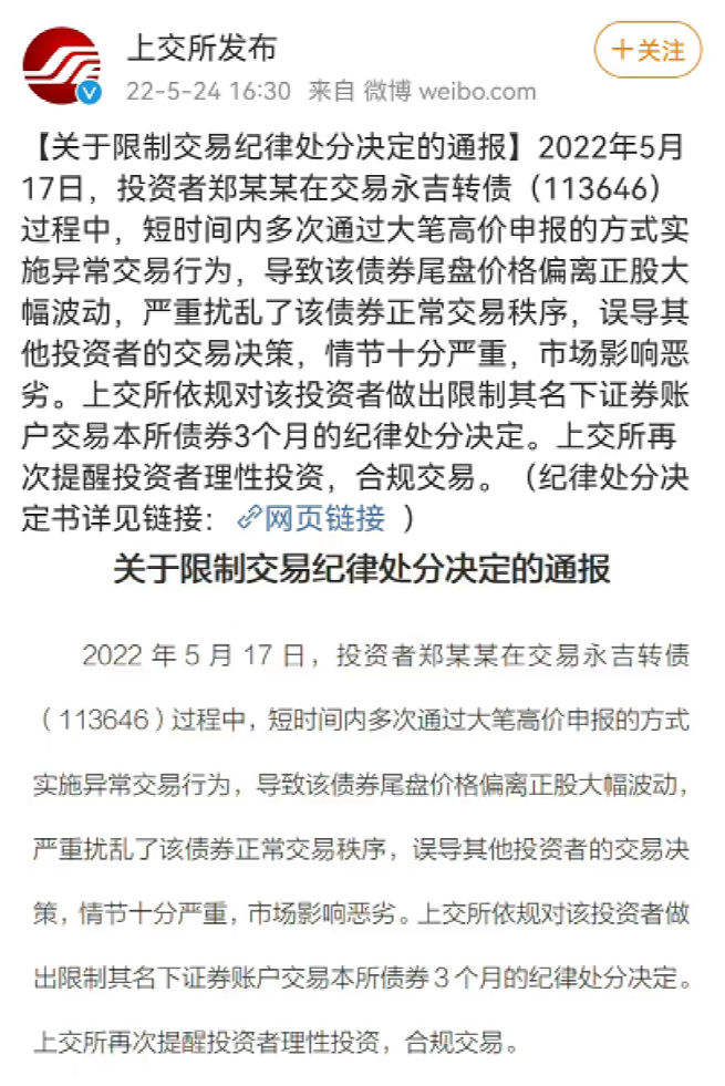 日前,上交所官方微博发布“关于限制交易纪律处分决定的通报”,当事人郑某某短时间内多次通过大笔高价申报的方式实施异常交易,扰乱债券正常交易秩序,对其名下相关证券账户实施3个月的限制交易。