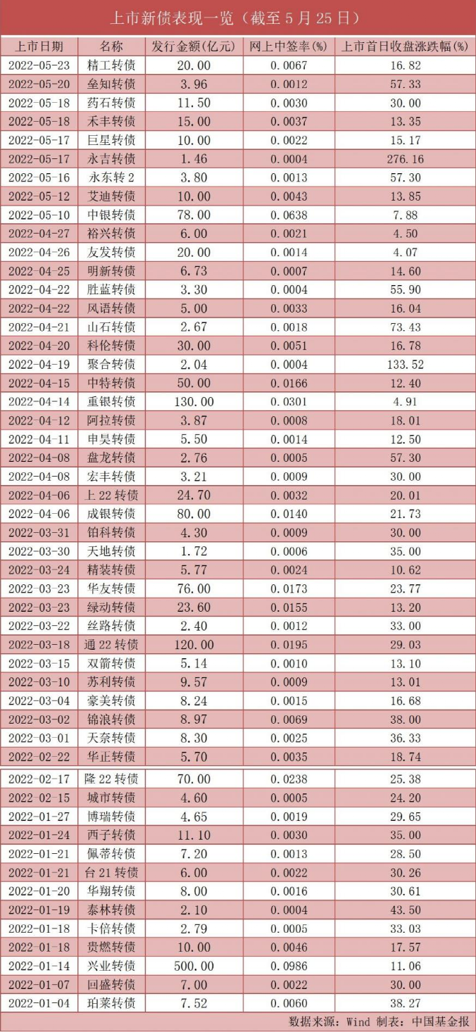 Wind 数据显示,今年以来共有51只新转债上市交易,其中47只上市首日涨幅超10%,其中29只转债首日涨幅超20%。除了永吉转债首日涨幅高达276.16%外,4月19日上市交易的聚合转债首日涨幅也超过100%,达到133.52%。