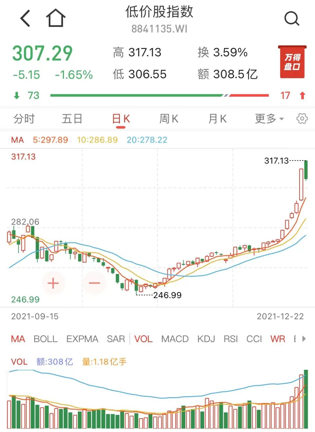 周三(12月22日),沪深两市全天窄幅震荡,三羊马特停后妖股军团炒作进入退潮期。日内热门股波动幅度极大,尽管有中锐股份反包涨停出现,但风范股份、湖南天雁等多只热门股跌停仍然压制炒作情绪。昨日超40只地产股涨停后,低价炒作迅速降温,Wind低价股指数高开低走收下长阴,板块成交额再创历史新高。