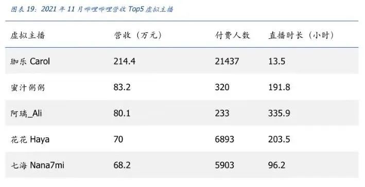 参考2021年11月哔哩哔哩虚拟主播营收,当月虚拟主播总收入达到了5466万元,付费人数达到了25.5万人。位居第一位的虚拟主播“珈乐Carol”创下了单月214万元的收入。其中,一场维持4小时的生日派对直播创下了单场189万的收入。