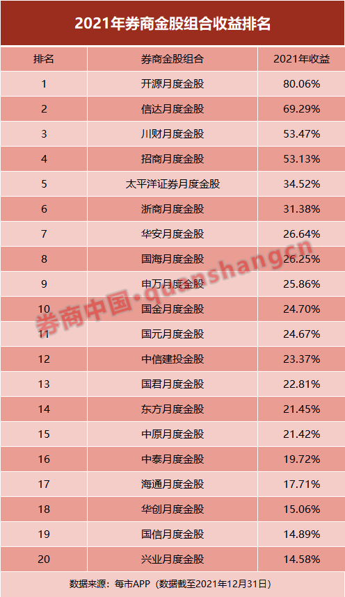 具体来看,开源证券金股组合以80.06%的收益稳居第一,这个业绩即使放在所有公募基金中也能排进前十。券商中国记者查阅天天基金网发现,截至2021年12月30日,全市场9000余只公募基金中仅8只基金收益率超80%。