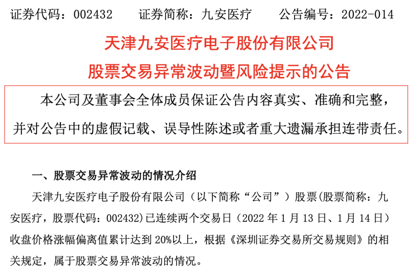 首先是,10倍新冠大牛股——九安医疗(002432)接连预警,密集发出了风险警示信号:102亿元的合同或订单可能存在无法如期或全部履行的风险。
