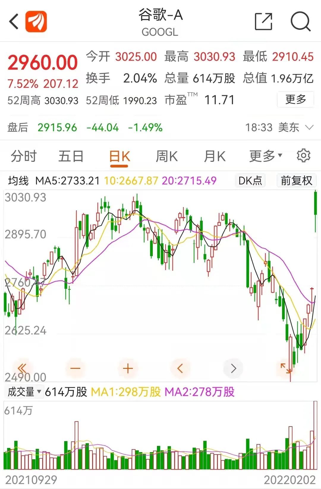 更值得关注的是,2月2日盘前,市值超过11万亿人民币(1.82万亿美元)的谷歌大爆发,股价一度狂飙超过10%。这种涨幅极为罕见。截至收盘,谷歌涨7.52%。