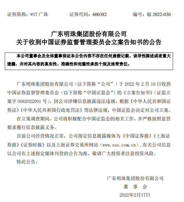 2月16日晚,*ST广珠公告,收到证监会《立案告知书》,因涉嫌信息披露违法违规,证监会决定对公司立案。