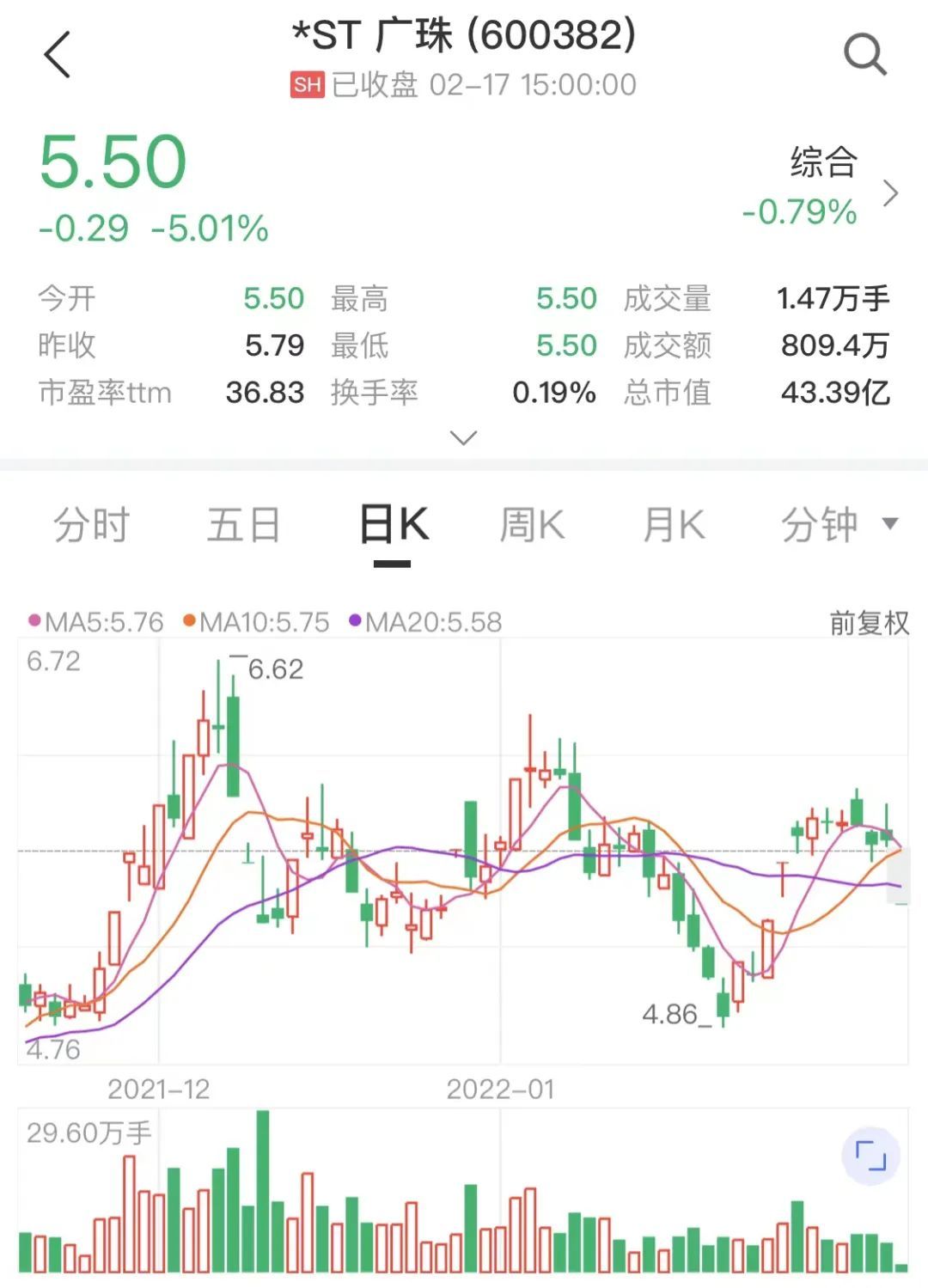 2月17日,*ST广珠“一”字跌停,收报5.5元/股,市值43.39亿元。