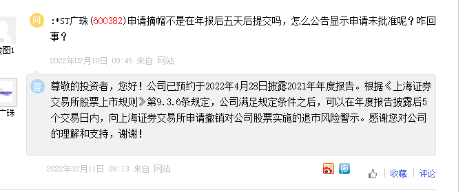 2月11日,公司在互动平台表示,已预约4月28日披露2021年度报告。根据有关规定,公司满足规定条件之后,可以在年度报告披露后5个交易日内,向上交所申请撤销对公司股票实施的退市风险警示。