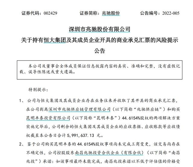 兆驰股份同时公告了《 关于持有恒大集团及其成员企业开具的商业承兑汇票的风险提示公告》。