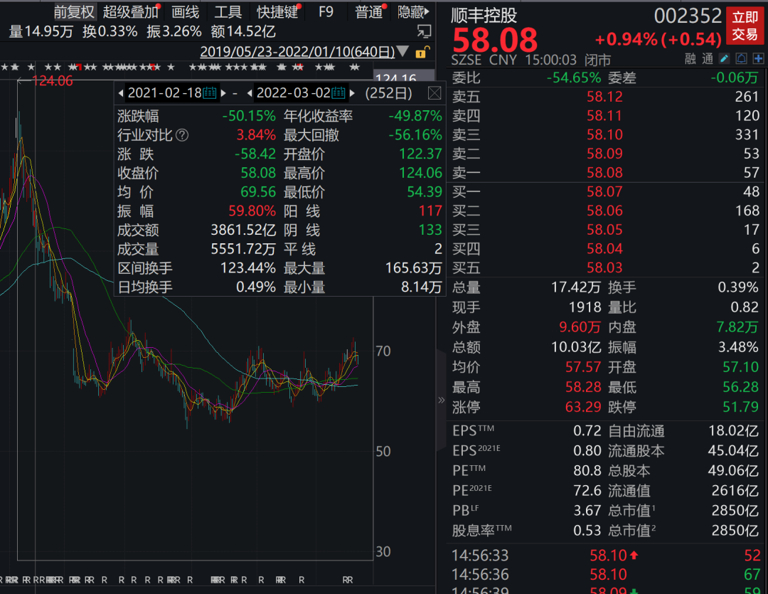 而从股价表现来看,近去年多,顺丰一直处于下滑通道。自去年2月突破124元每股后,股价便跌跌不休,最新股价为58元每股,市值距离高点也已经蒸发超3200亿元,最新市值2850亿元。