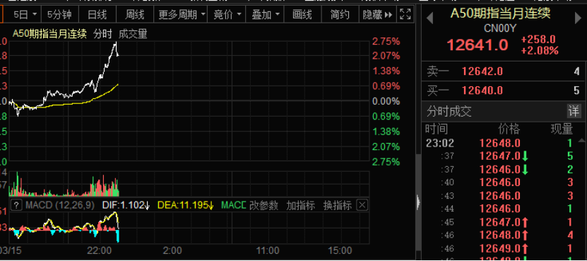 北京时间3月15日21:45过后,外围中国资产突然暴涨。首先,A50狂拉近2.5%。