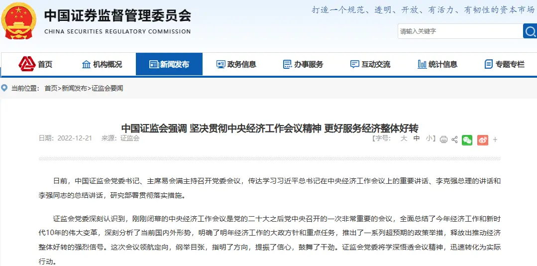 证监会党委深刻认识到,中央经济工作会议强调要坚持发展是党执政兴国的第一要务,把稳增长摆在更加突出的位置,各方面政策向稳增长聚焦发力。特别是积极的财政政策加力提效,扩大支出规模,更好发挥撬动社会资金的杠杆作用。稳健的货币政策精准有力,保持流动性合理充裕,加大对小微企业、科技创新、绿色发展等领域的支持力度。抓住总需求不足这个突出矛盾,把实施扩大内需战略和深化供给侧结构性改革有机结合起来,着力恢复和扩大消费,充分释放消费潜力,通过政府投资和政策激励有效带动全社会投资,更好发挥投资对稳增长的关键作用。中央强调,要切实落实“两个毫不动摇”,从制度和法律上把对国企民企平等对待的要求落下来,从政策和舆论上鼓励支持民营经济和民营企业发展壮大,依法保护民营企业产权和企业家权益。2019年以来,民营企业IPO家数、融资金额分别占A股市场的81.75%和60.56%,这些不争的事实折射出党的政策对民营经济的支持是一贯的、有力的。这次会议深刻阐述了房地产在国民经济中的重要地位和作用,明确提出要提供足够流动性,满足行业合理融资需求,推动行业重组并购,支持刚性和改善性住房需求,确保房地产市场平稳发展,推动房地产业向新发展模式平稳过渡。这次会议进一步明确了对平台企业的监管政策,强调要大力发展数字经济,提升常态化监管水平,支持平台企业在引领发展、创造就业、国际竞争中大显身手。中央关于优化疫情防控措施、推动平稳转段的决策部署将给经济恢复带来重大积极影响,疫情冲击将是短暂、有限的,预计明年社会生产生活秩序会加快恢复,经济活力加速释放。还要看到,上述政策将极大地提振市场信心,激发全社会干事创业的活力,有利于形成干部敢为、地方敢闯、企业敢干、群众敢首创的生动局面。对我国经济发展的光明前景要充满信心。