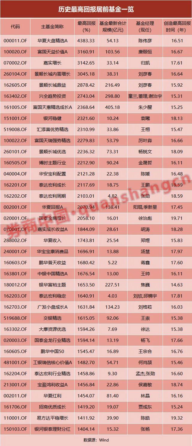 自1998年首只公募基金产品成立以来,上证指数上涨了1.7倍,10倍个股比比皆是。Wind数据显示,未清盘的翻倍基金数量有2600多只(份额分开计算),最高回报超过10倍的基金数量高达79只。历史最高回报超14倍的基金产品合计有36只。但这些业绩表现优秀的“长胜选手”实际上都是以牺牲阶段性回撤,或忍受高仓位导致的下跌风险换来的。