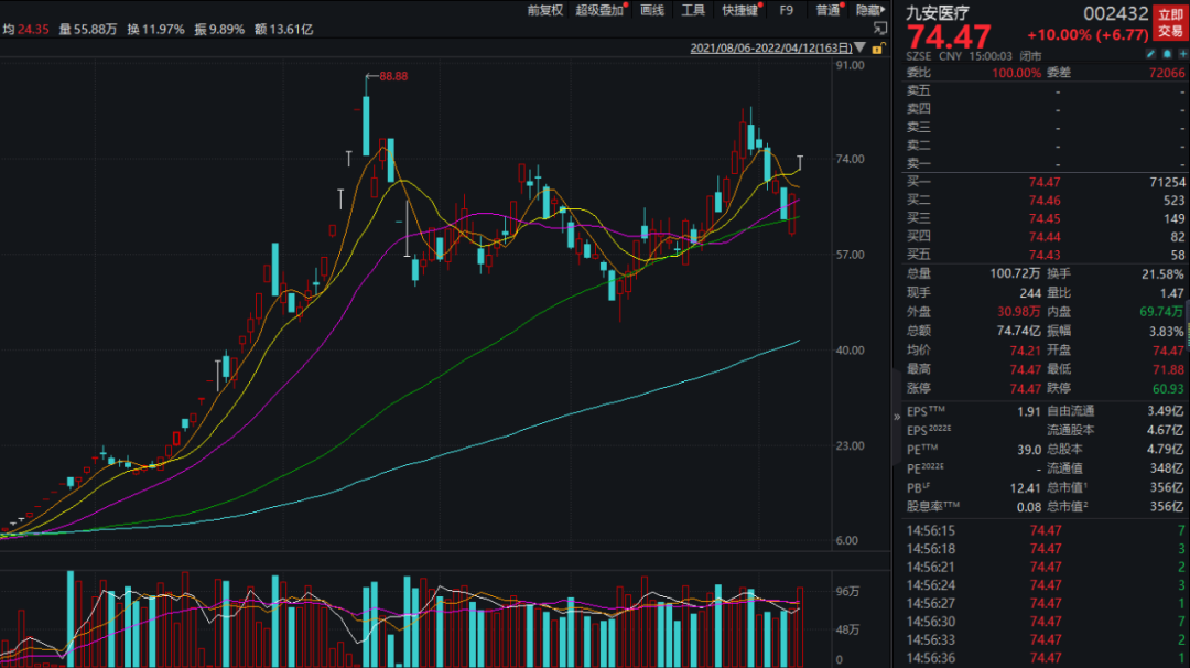 虽然市场此前已对九安医疗业绩增长有预期,但如此高速的增长,仍超出了许多投资者的想象。受上述利好消息刺激,九安医疗当日以涨停价开盘,盘中虽然短暂开板,但随后又封死涨停直至收盘,全天成交74.7亿元,换手率超21%,最新市值为356亿元。