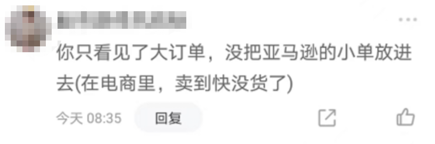 也有人不敢相信:“不会是乌龙,忘记打小数点了吧”。另有网友表示,是不是销售额写成利润了?对此,有投资者回应称:你只看见了大订单,没把亚马逊的小单放进去,在电商里,卖到快没货了。